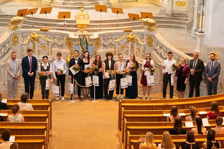 | Mit Elisabeth Klötzer hatte die "Glück auf!" - Oberschule Eibenstock auch im Schuljahr 2024/2025 wieder eine Absolventin unter den Besten Sachsens. Die Auszeichnungsfeier fand am 23.06.2025 in der Frauenkirche (Dresden) statt. | |